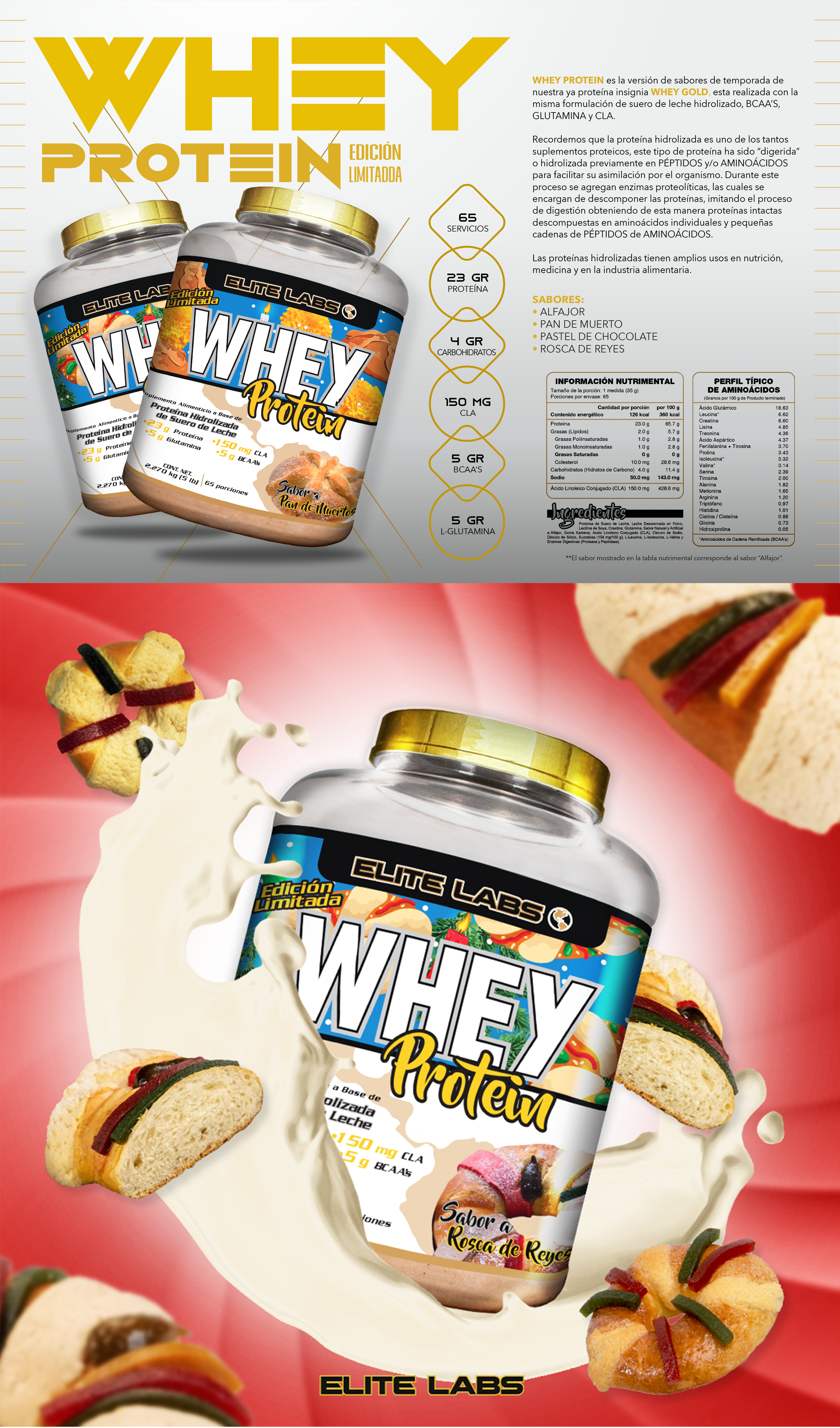 WHEY PROTEIN de Elite Labs es nuestra clásica y proteína insignia WHEY GOLD, en una edición limitada con el sabor mexicano de invierno, sabor ROSCA DE REYES, un sabor clásico y cultural de nuestro pais.