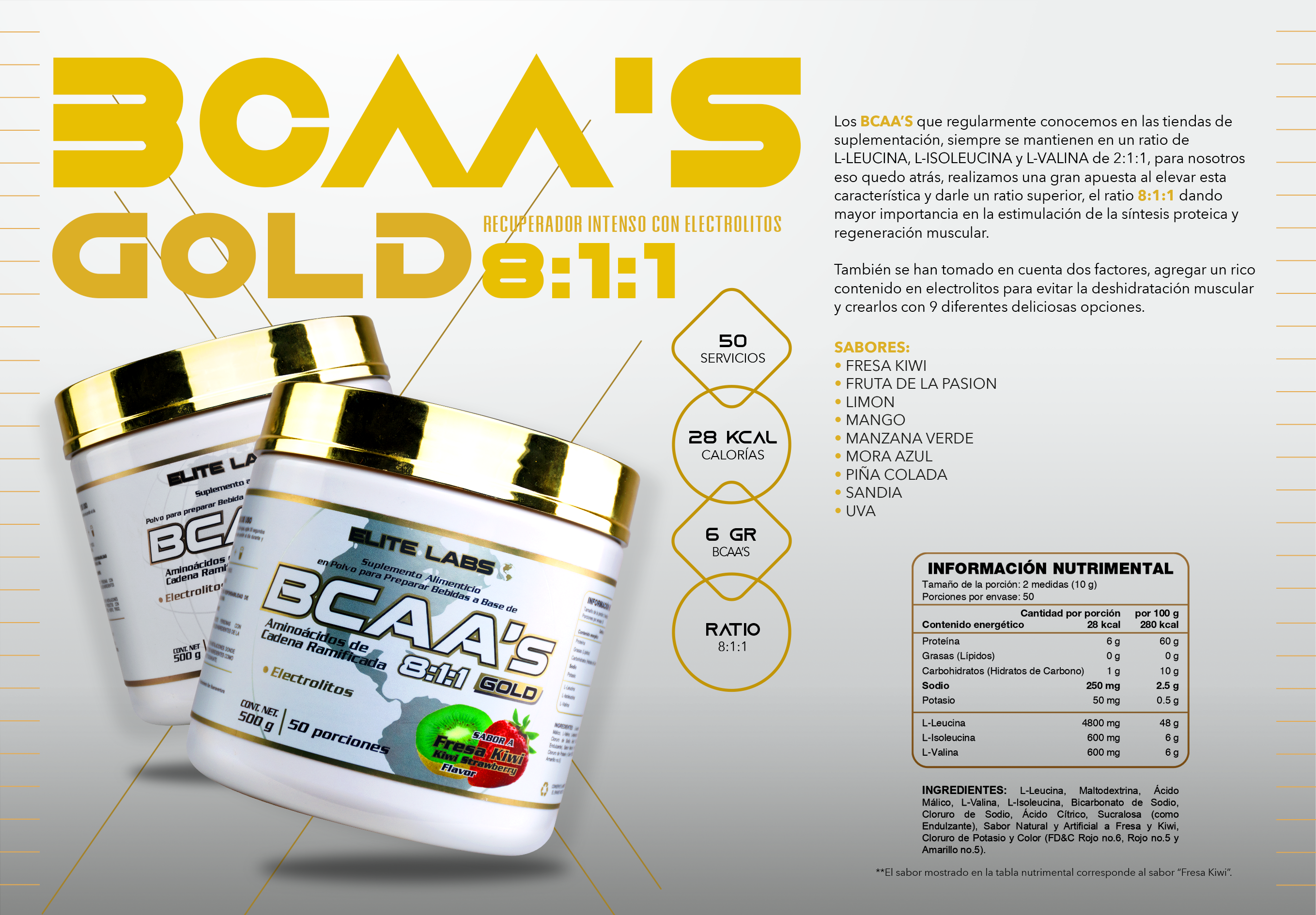 Los elementos que conforman la fórmula de nuestros “BCAA’S GOLD” son L-Leucina, L-Isoleucina y L-Valina, pero con un ratio superior el 8:1:1, proporcionando 8 partículas de leucina por 1 de Isoleucina y 1 de valina, dando mayor importancia a la estimulación de la síntesis de proteína muscular.