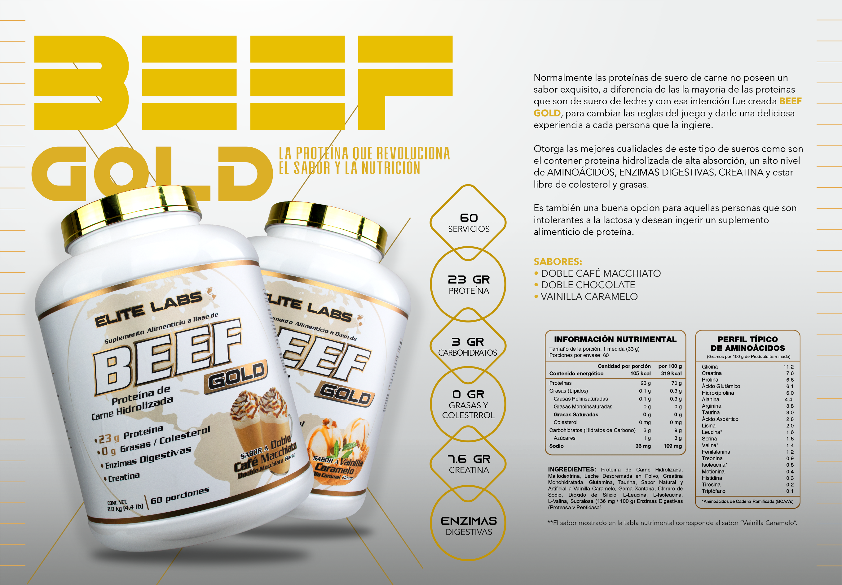“BEEF GOLD” Es una Proteína hidrolizada de origen de animal con un proceso de extracción avanzada, clarificación de hidrolisis y tecnología de aislamiento utilizados en este producto, que te proporcionara la potencia aislada necesaria para la construcción de los músculos.