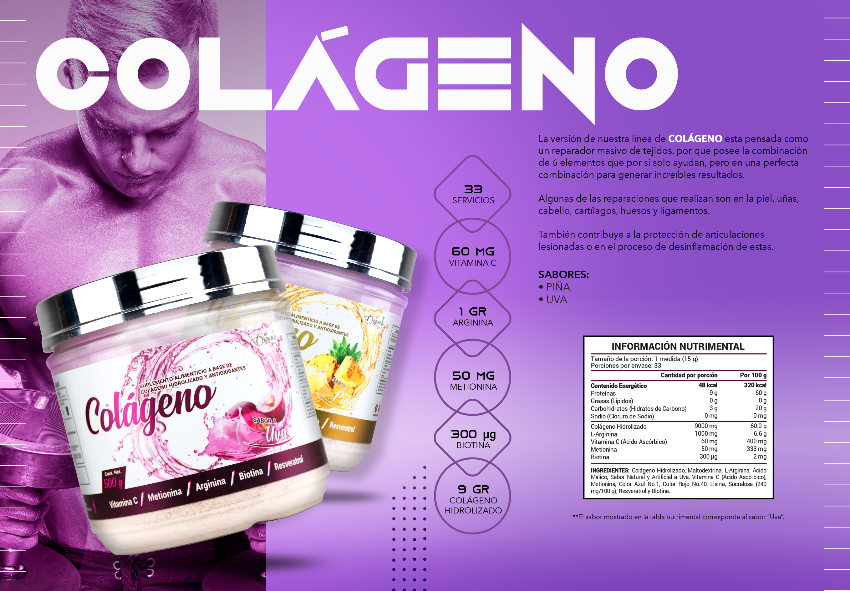 El colágeno de Organic Sports, esta diseñado como reparador masivo de tejidos, por que posee la combinación perfecta para ello: colágeno hidrolizado, vitamina C, metionina, arginina, biotina, resveratrol.