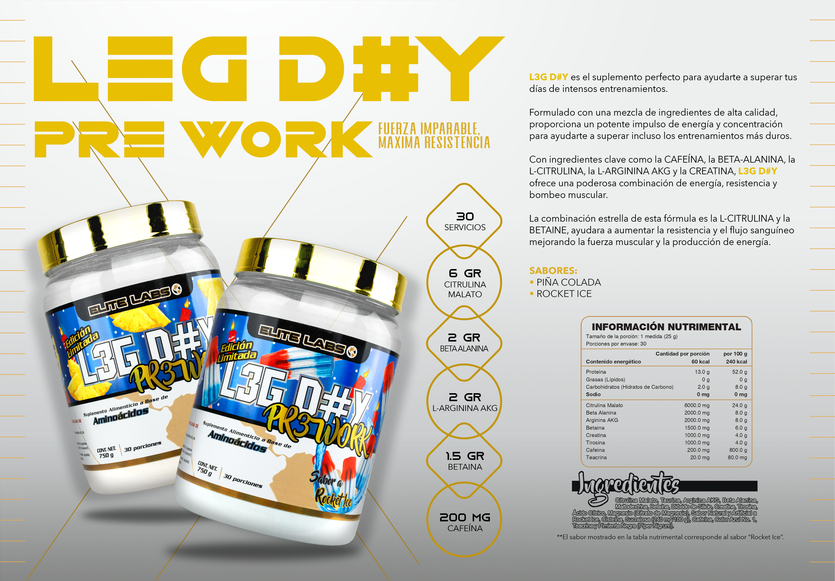 Con ingredientes clave como la cafeína, la beta-alanina, la L-citrulina, la L-arginina akg y la creatina, L3G D#Y ofrece una poderosa combinación de energía, resistencia y bombeo muscular.