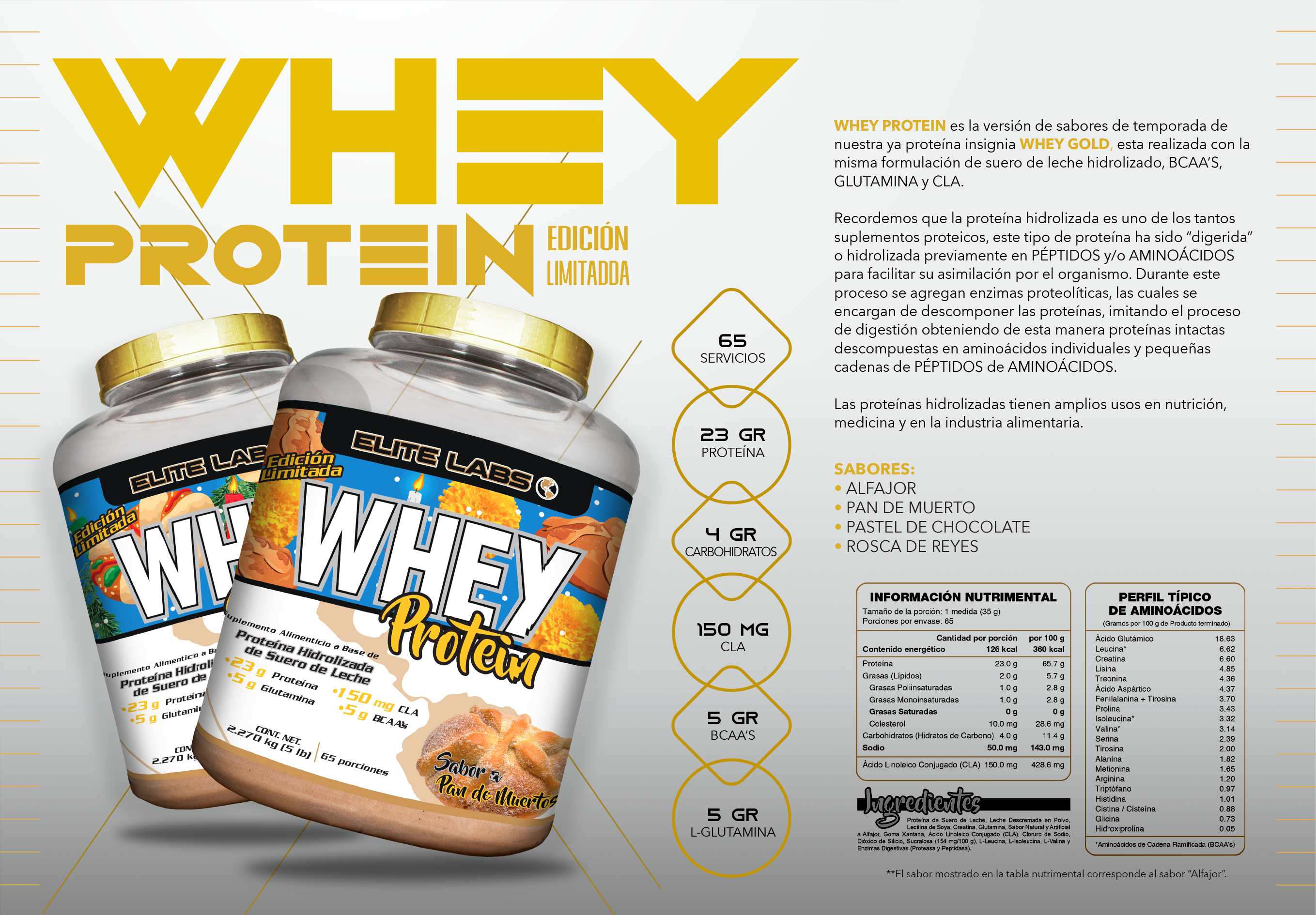 WHEY PROTEIN de Elite Labs es nuestra clásica y proteína insignia WHEY GOLD, solo que con una nueva presentación que para vivir el 8vo Aniversario de la marca, contiene un Aislado de Proteína de Suero de Leche Hidrolizado de calidad PREMIUM, mediante el uso de WPI como el ingrediente principal junto con el concentrado de ultra filtración, se pudo agregar 23gr de proteína por porción, más EAA’S, BCAA’S, GLUTAMINA y CLA.